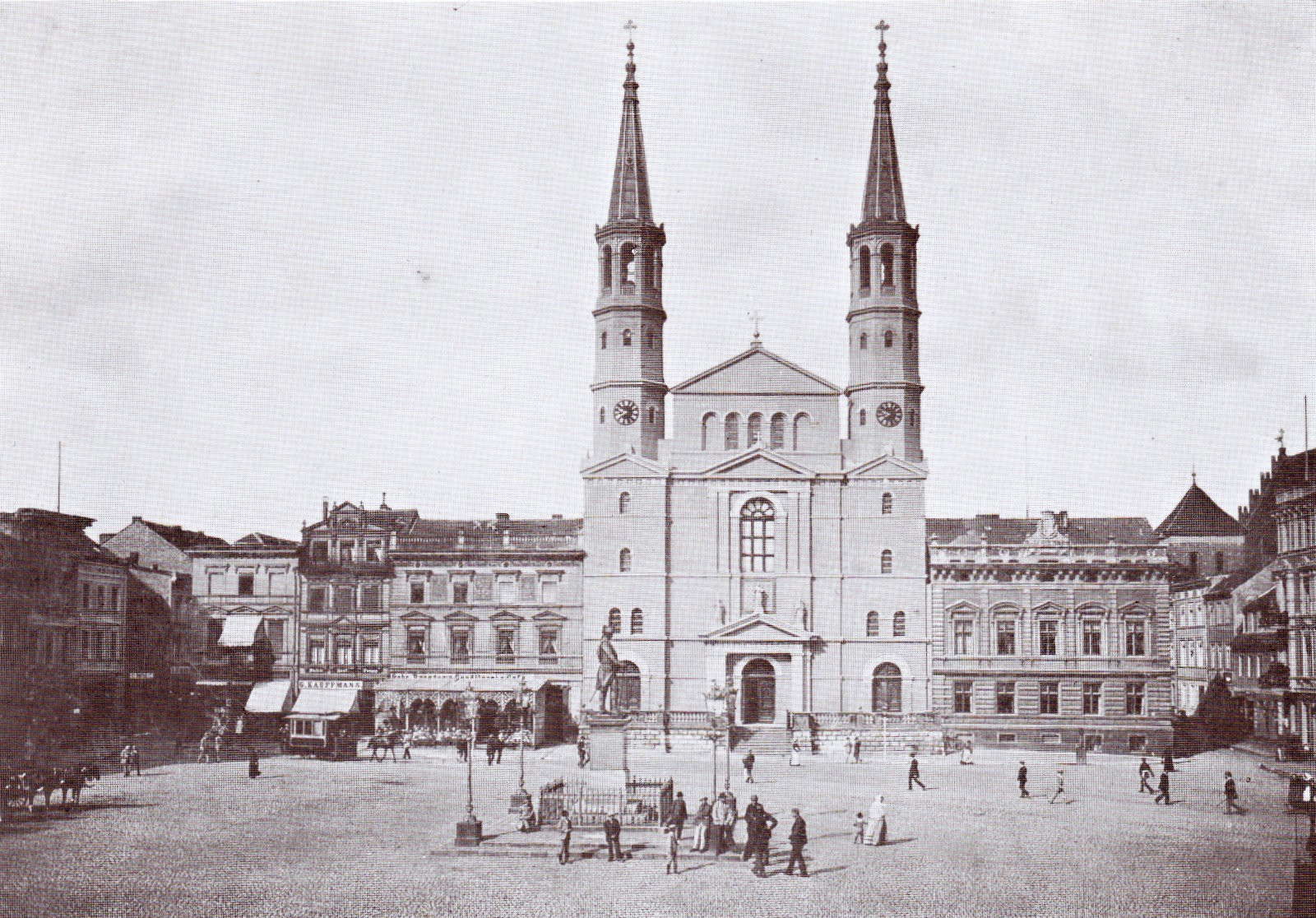 Widok rynku z pozostałościami ratusza i dwiema wieżami dawnego kościoła jezuitów (patrz pkt. 6), ok. 1819 r., akwarela i rys. tuszem P. B. Jaeckel